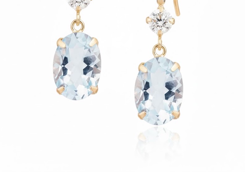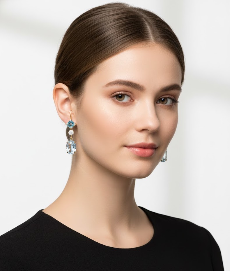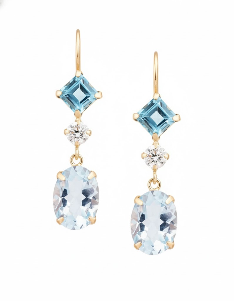 透き通るようなアクアマリンと、深みあるブルートパーズを上下に組み合わせた上品なドロップピアス。中央に配したダイヤモンドが光を受けて輝きを増し、全体に清らかで気品ある印象を与えます。
