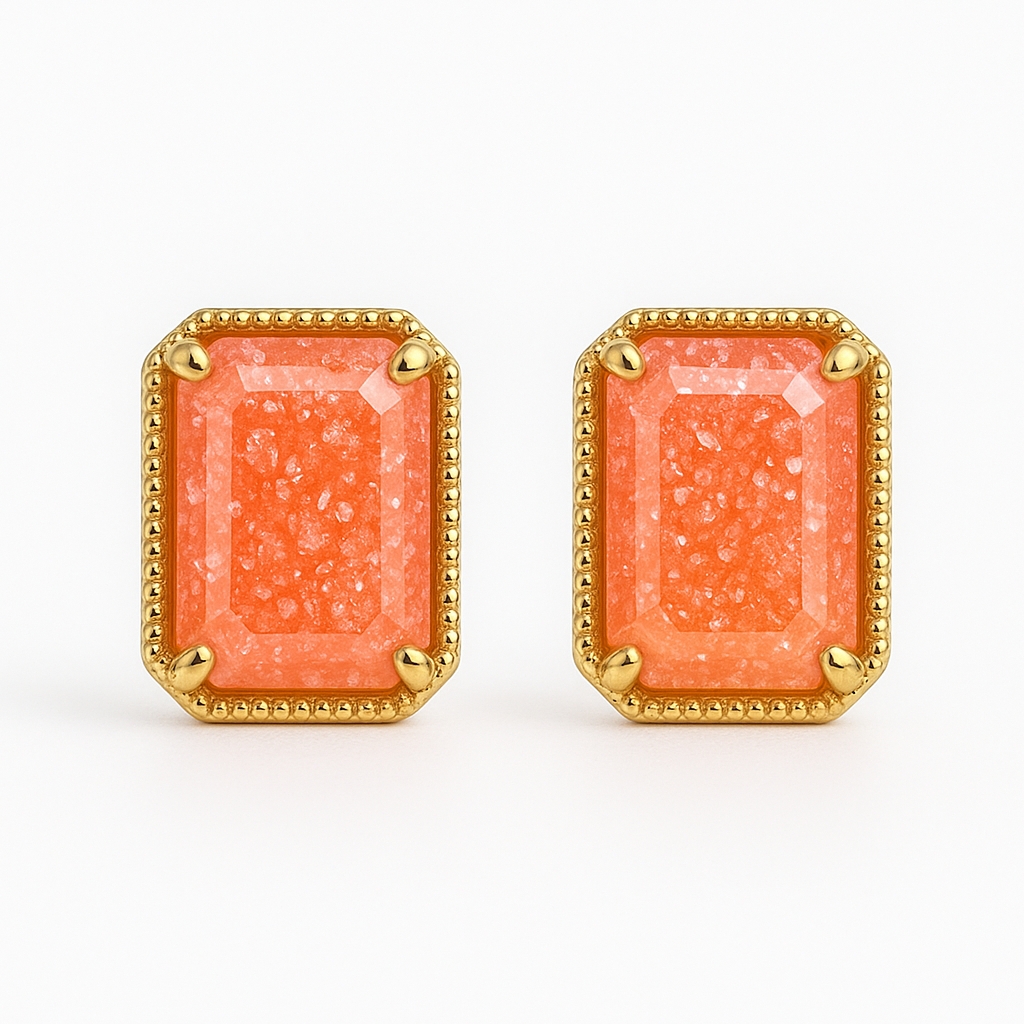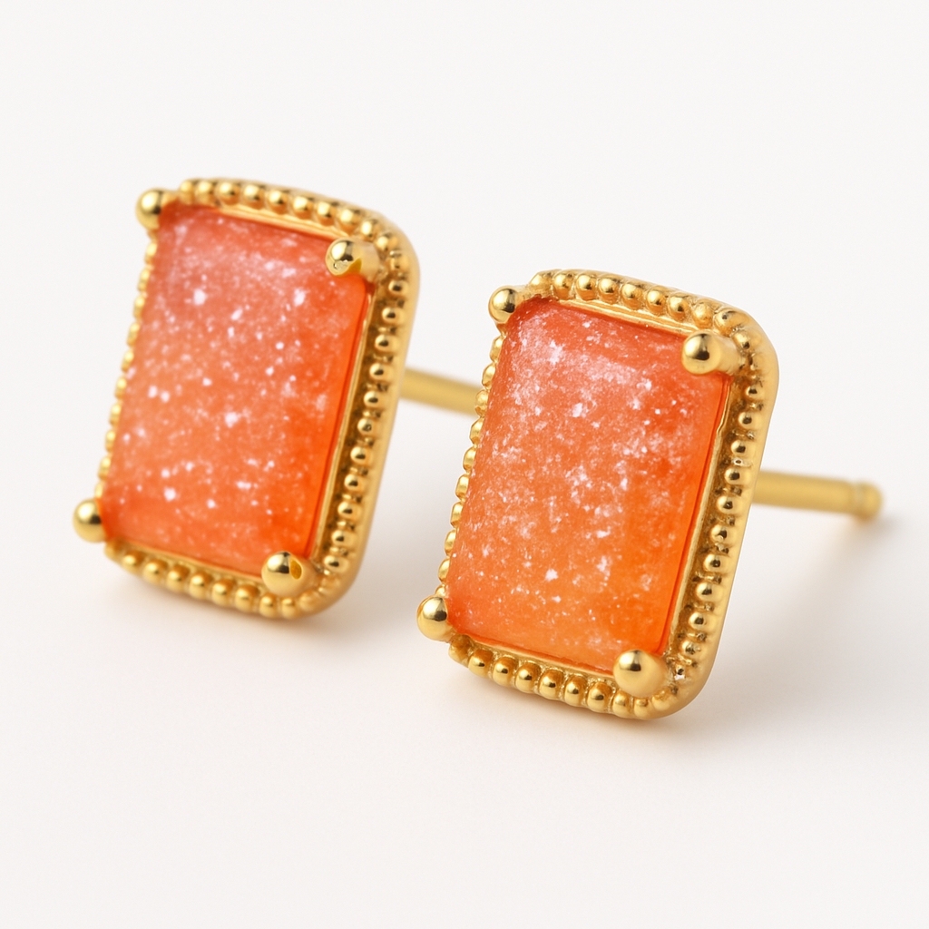太陽の光を閉じ込めたような鮮やかなオレンジサンストーンを、エメラルドカットで贅沢に仕立てたピアス。石の中に微細な結晶がきらめき、動くたびに温かみのある輝きを放ちます。