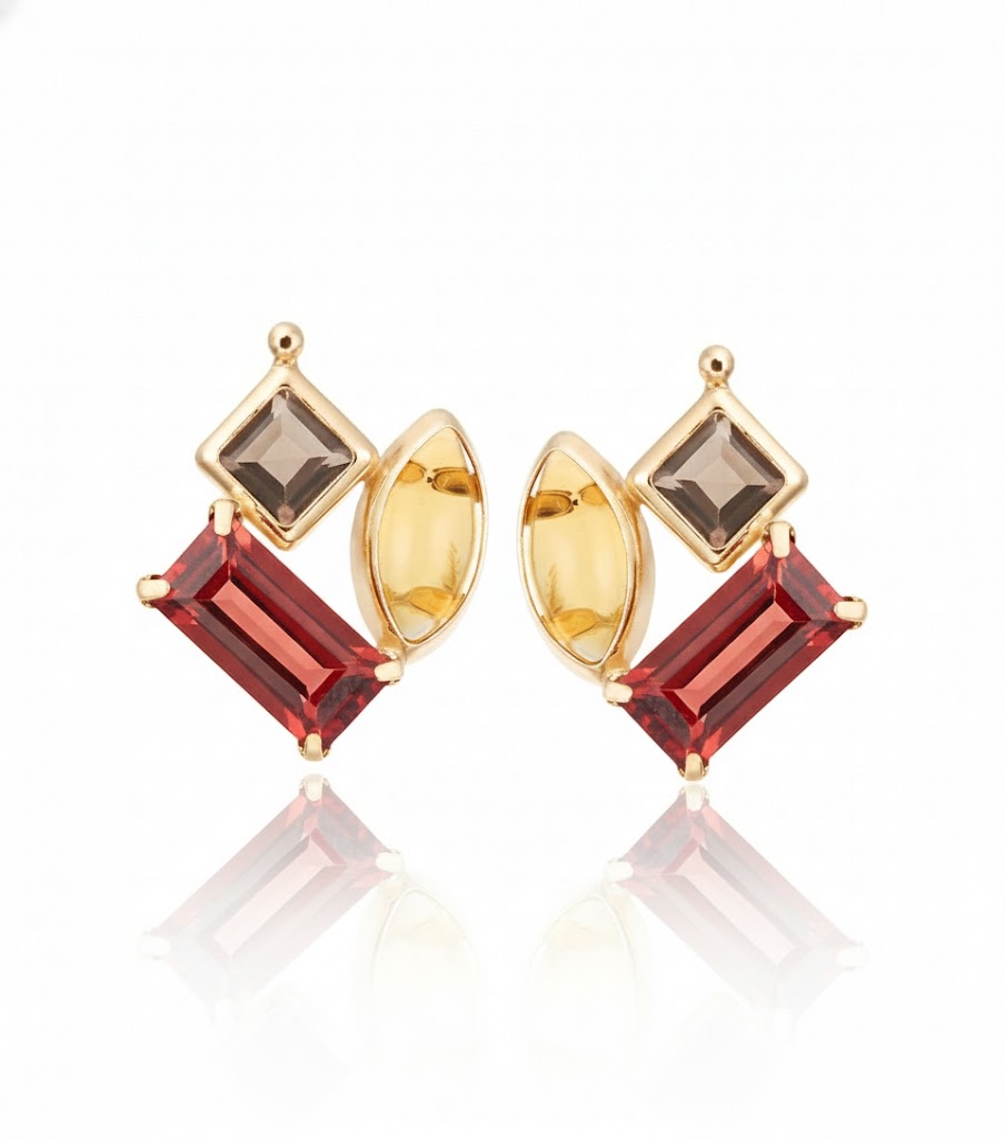 深紅のガーネットとスモーキークォーツを組み合わせた、モダンな配色が魅力のピアス。幾何学的なストーンカットを組み合わせた立体的なデザインが、角度によって異なる表情を見せます。