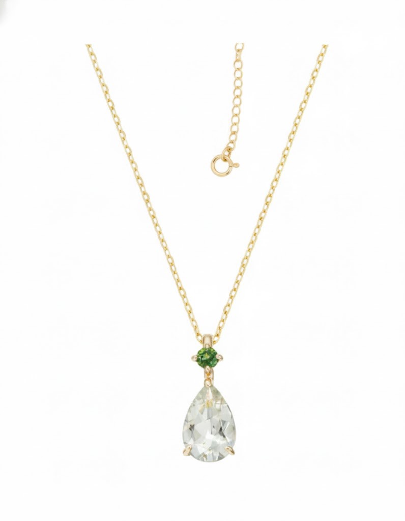 瑞々しい透明感を放つペアシェイプカットの天然クォーツに、鮮やかなグリーンガーネットを添えたK18イエローゴールドネックレス。軽やかに揺れるティアドロップのフォルムがデコルテを美しく見せ、ガーネットの深い緑が上品なアクセントを加えます。シンプルなチェーンと華奢な石座が、石の輝きを引き立てるデザイン。職人の手による精緻な仕上げで、日常から特別なシーンまで幅広く活躍します。