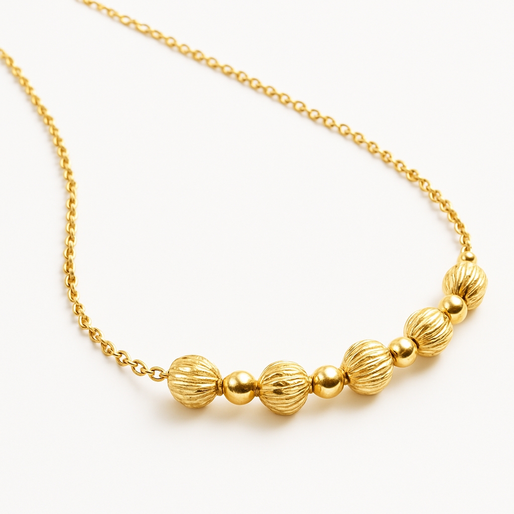 表面に繊細な凹凸を施したグレインビーズを連ねた、K18イエローゴールドのネックレス。ビーズの表面が光を柔らかく反射し、上品な温かみを感じさせます。シンプルながらもリズミカルな配置が華やかで、デイリーにもフォーマルにも使いやすいデザイン。