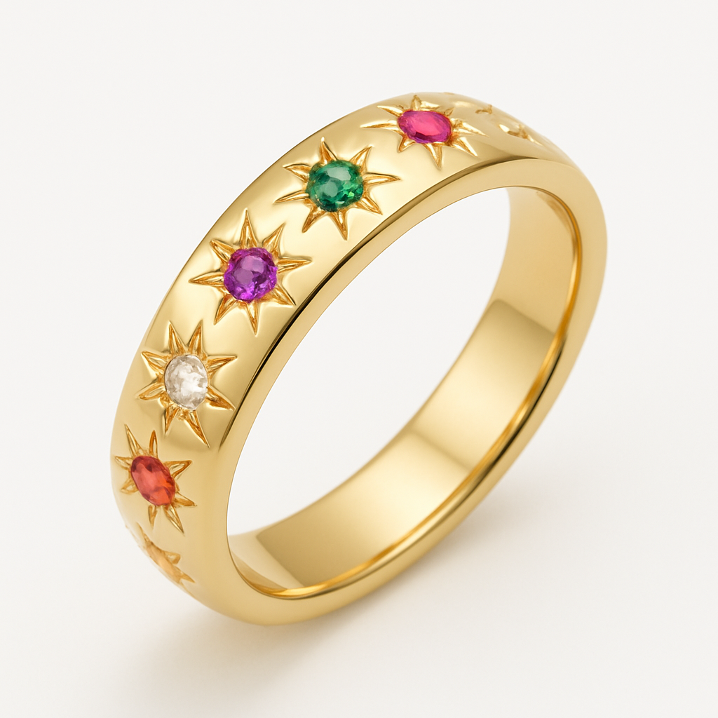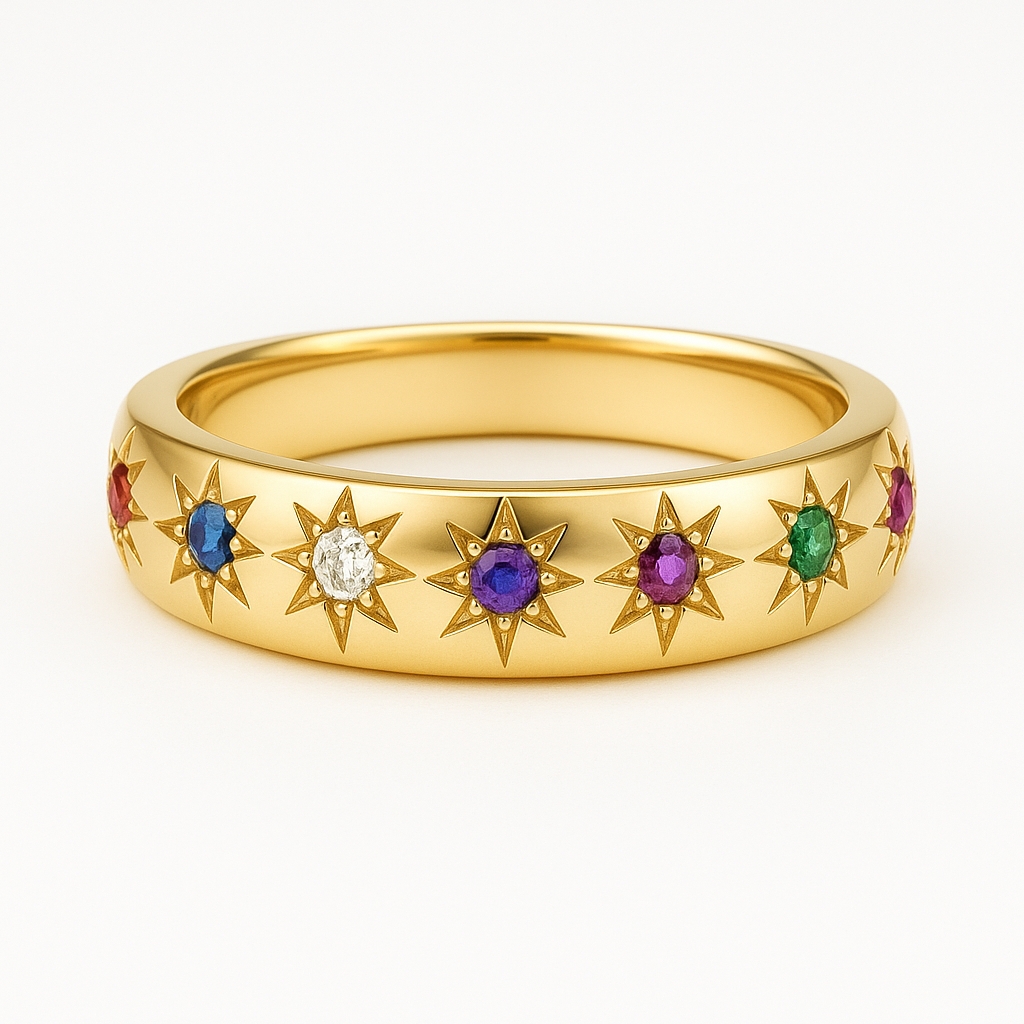 星型にカットされたセッティングに、ルビー・サファイア・エメラルド・アメジストなどの天然カラーストーンを均等に配したラグジュアリーなK18イエローゴールドリング。中央にはブリリアントカットのダイヤモンドを配置し、各ストーンが夜空に散る星のように輝きます。職人による繊細なミル打ちと鏡面仕上げが、ジュエリーとしての完成度を一層引き立てます。普段使いにも、フォーマルなシーンにも対応できる華やかさと気品を兼ね備えた逸品です。