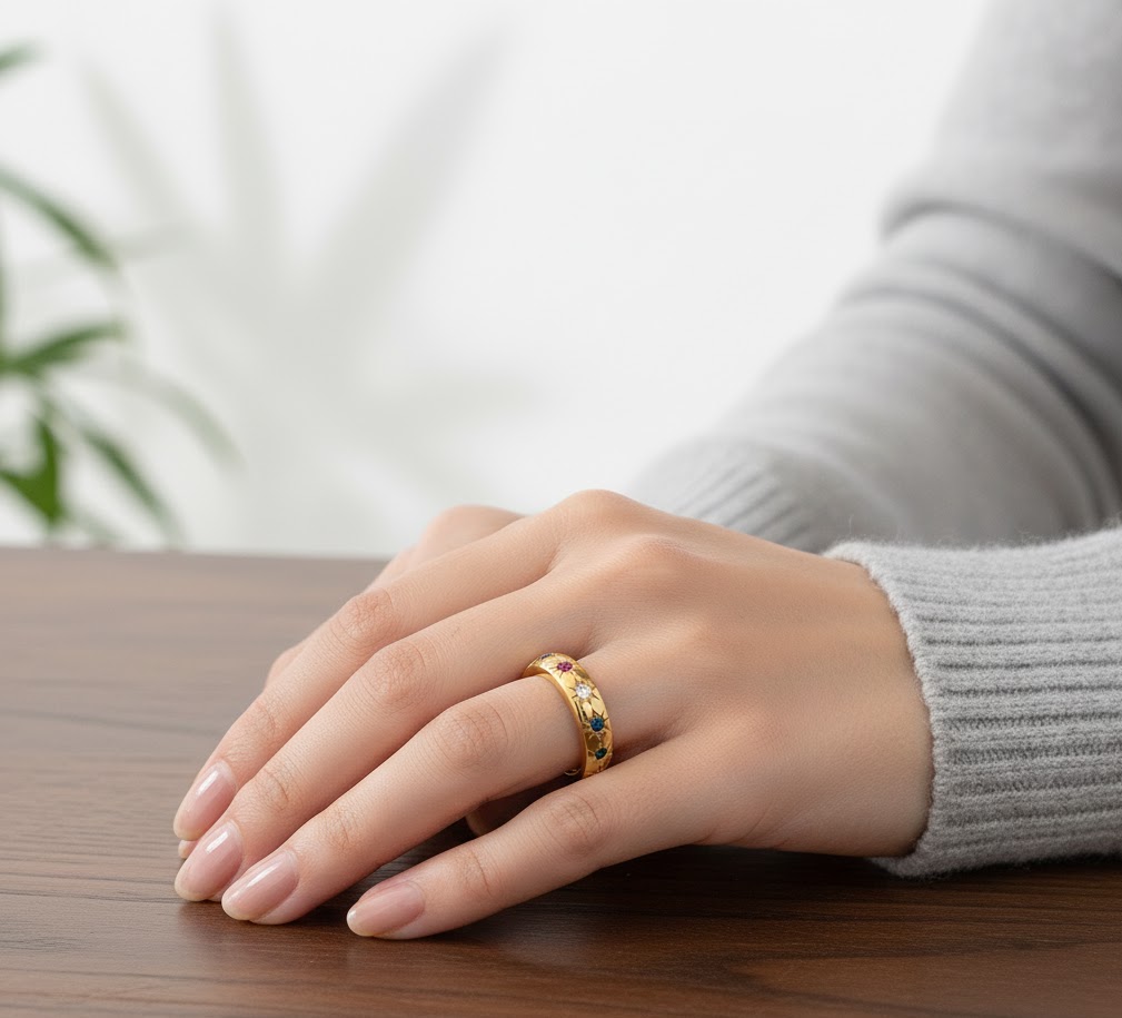 天然カラーストーンを散りばめたK18リング。星のように輝く宝石が、手元を鮮やかに照らします。